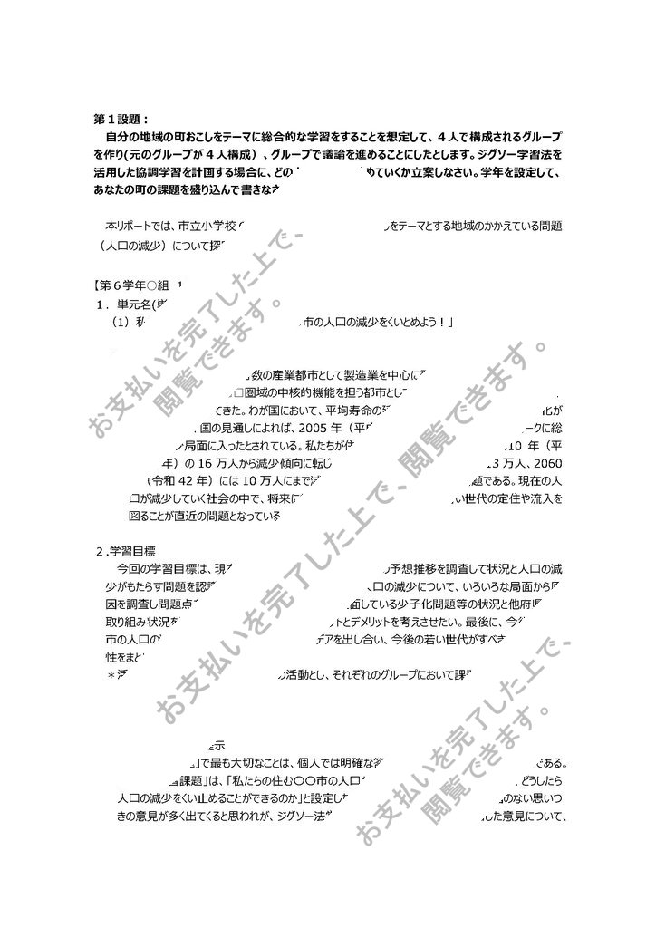 本リポートでは、市立小学校6年生を対象に、地域の町おこしをテーマとする地域のかかえている問題(人口の減少)について探究的な学習課題を取り上げる。