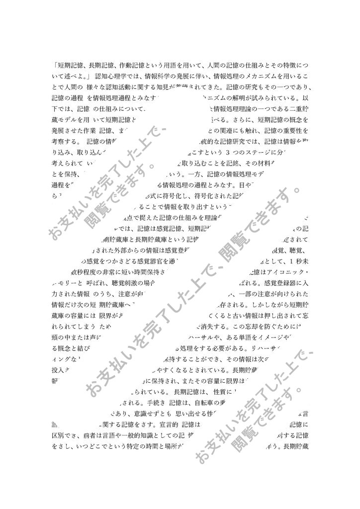 設題:「短期記憶、長期記憶、作動記憶という用語を用いて、人間の記憶の仕組みとその特徴について述べよ。」