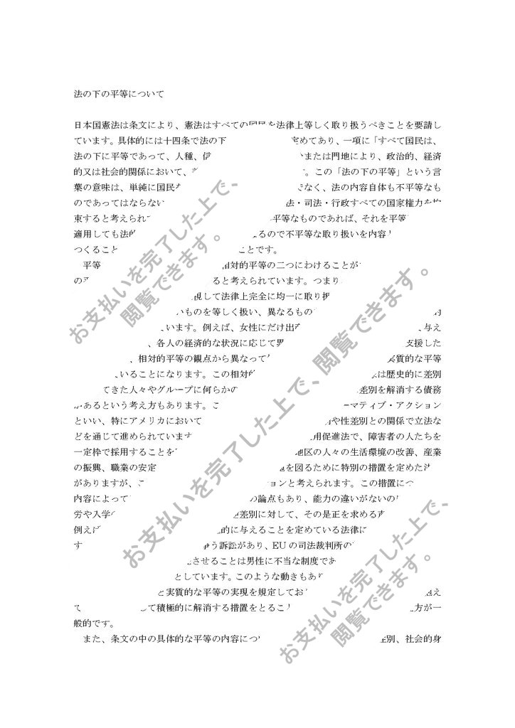 日本国憲法は条文により、憲法はすべての国民を法律上等しく取り扱うべきことを要請しています。具体的には十四条で法の下の平等について定めてあり、一項に「すべて国民は、法の下に平等であって、人種、信条、性別、社会的身分または門地により、政治的、経済的又は社会的関係において、差別されない。」とあります。この「法の下の平等」という言葉の意味は、単純に国民を平等に取り扱うというだけでなく、法の内容自体も不平等なものであってはならないと解釈するのが一般的で、立法・司法・行政すべての国家権力を拘束すると考えられています。つまり法の内容が不平等なものであれば、それを平等に実施・適用しても法的平等は実現されないことになるので不平等な取り扱いを内容とする法律をつくること自体も禁止されているということです。