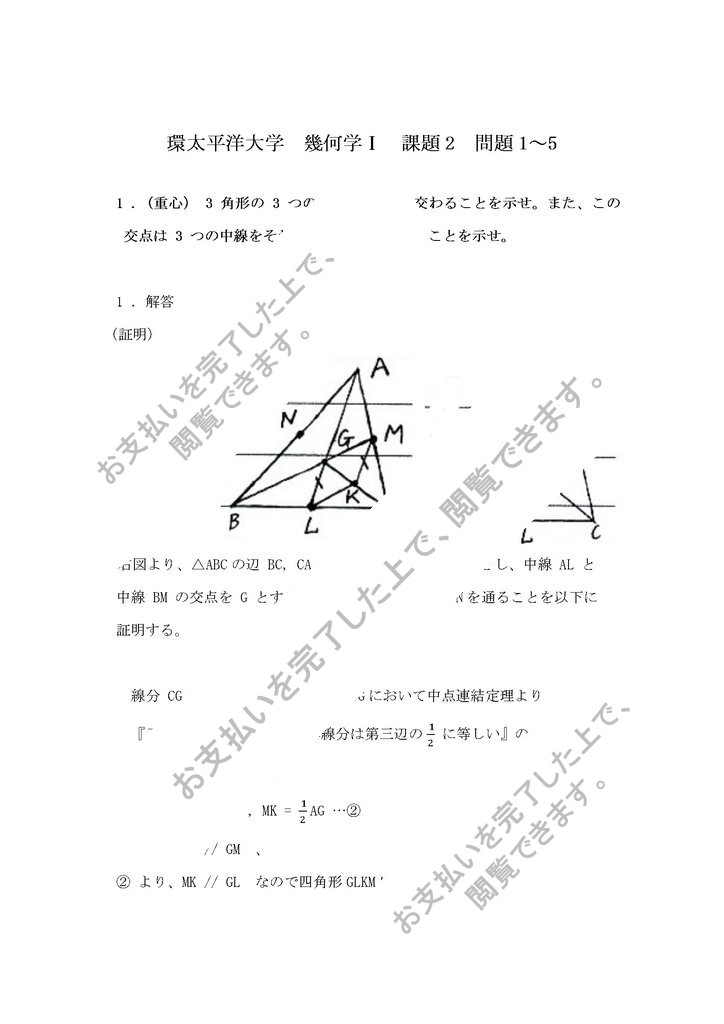 1.(重心)3角形の3つの中線は1点で交わることを示せ。また、この交点は3つの中線をそれぞれ2:1に分けることを示せ。