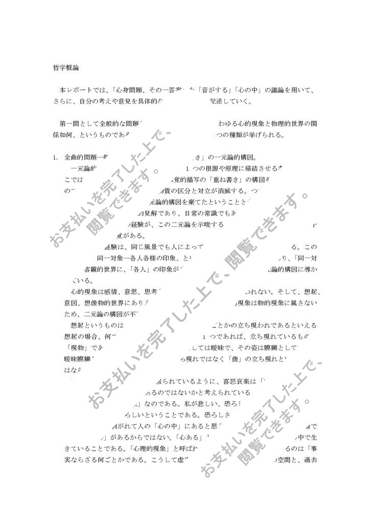 本レポートでは、「心身問題、その一答案」を「音がする」「心の中」の議論を用いて、さらに、自分の考えや意見を具体的な例を挙げながら記述していく。