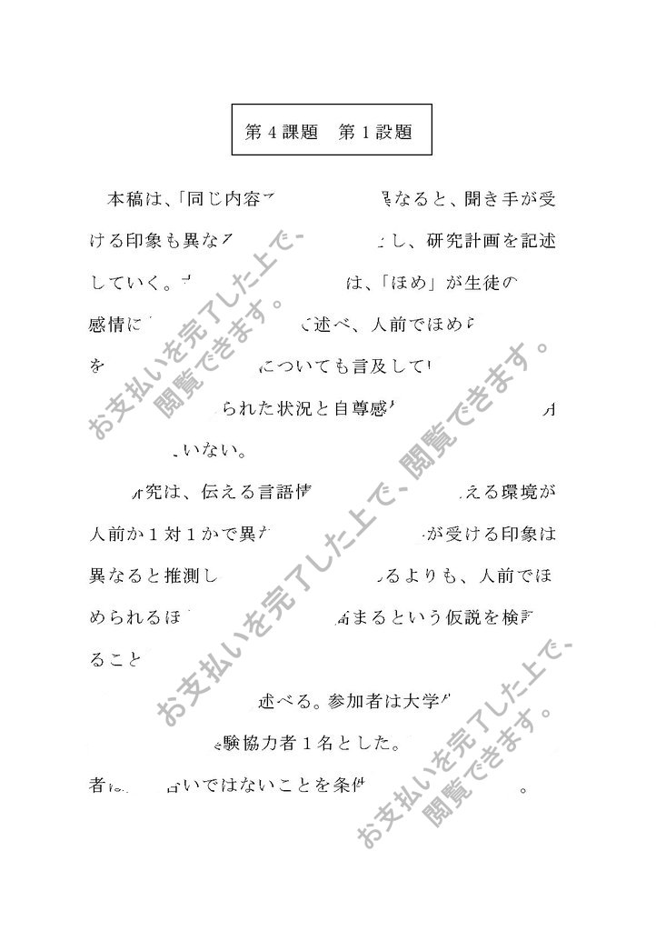 本稿は、「同じ内容でも伝え方が異なると、聞き手が受ける印象も異なるのか」をテーマとし、研究計画を記述していく。古市・柴田(2013)は、「ほめ」が生徒の自尊感情に与える影響について述べ、人前でほめられることを苦手とする子どもについても言及している。しかし、先行研究はほめられた状況と自尊感情との因果関係を明らかにしていない。