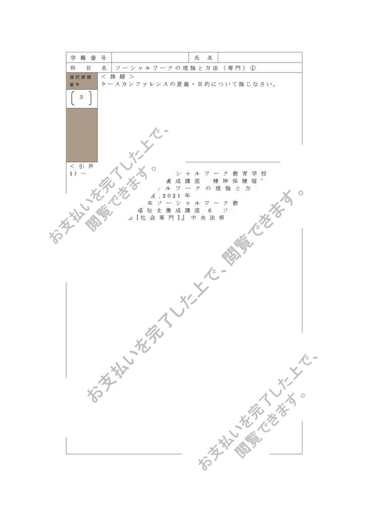 本レポートではケースカンファレンスの意義と目的について、4つの項目に分けて述べていく。加えて、社会福祉士がケースカンファレンスで求められる視野、役割についても4つの項目の後に述べる。なお、日本では、「ケースカンファレンス」、「事例検討会議」、「ケース会議」、「ケアカンファレンス」、「カンファレンス」、「ミーティング」など様々な呼び名で呼ばれる。厳密にはそれぞれ違いがあるのだが、現場レベルでは同じ意味を持つ言葉として使われていることが多いため、それに倣って、このレポートでは「ケースカンファレ...