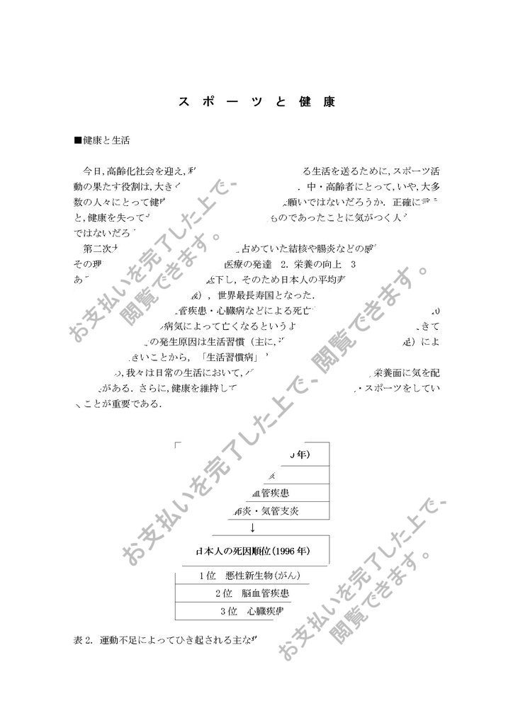 第二次大戦後,日本人の死因の上位を占めていた結核や腸炎などの感染症は激減した.その理由としてあげられるのは,1.医療の発達 2.栄養の向上 3.衛生環境の改善である.また同時に乳児死亡率も低下し,そのため日本人の平均寿命は飛躍的に伸び(男性:約76歳,女性:約83歳),世界最長寿国となった. しかし疾病傾向は,感染症にかわって,がんや脳血管疾患・心臓病などによる死亡が増加し,現在の日本人の10人に6人はこれらの病気によって亡くなるというように戦前とは大きく異なってきている.(表1)その発生原因は生活習慣(主に,過剰のカロリー摂取と運動不足)によるところが大きいことから,「生活習慣病」と呼ばれる.(表2)