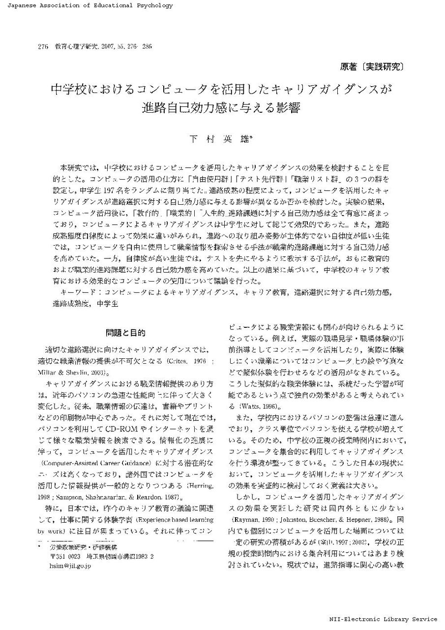 中学校におけるコンピュータを活用したキャリアガイダンスが進路自己効力感に与える影響(実践研究)