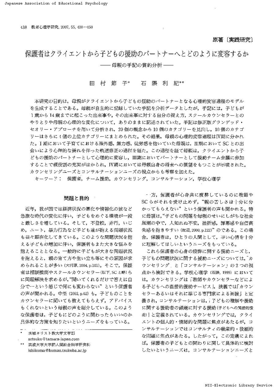 保護者はクライエントから子どもの援助のパートナーへとどのように変容するか 母親の手記の質的分析