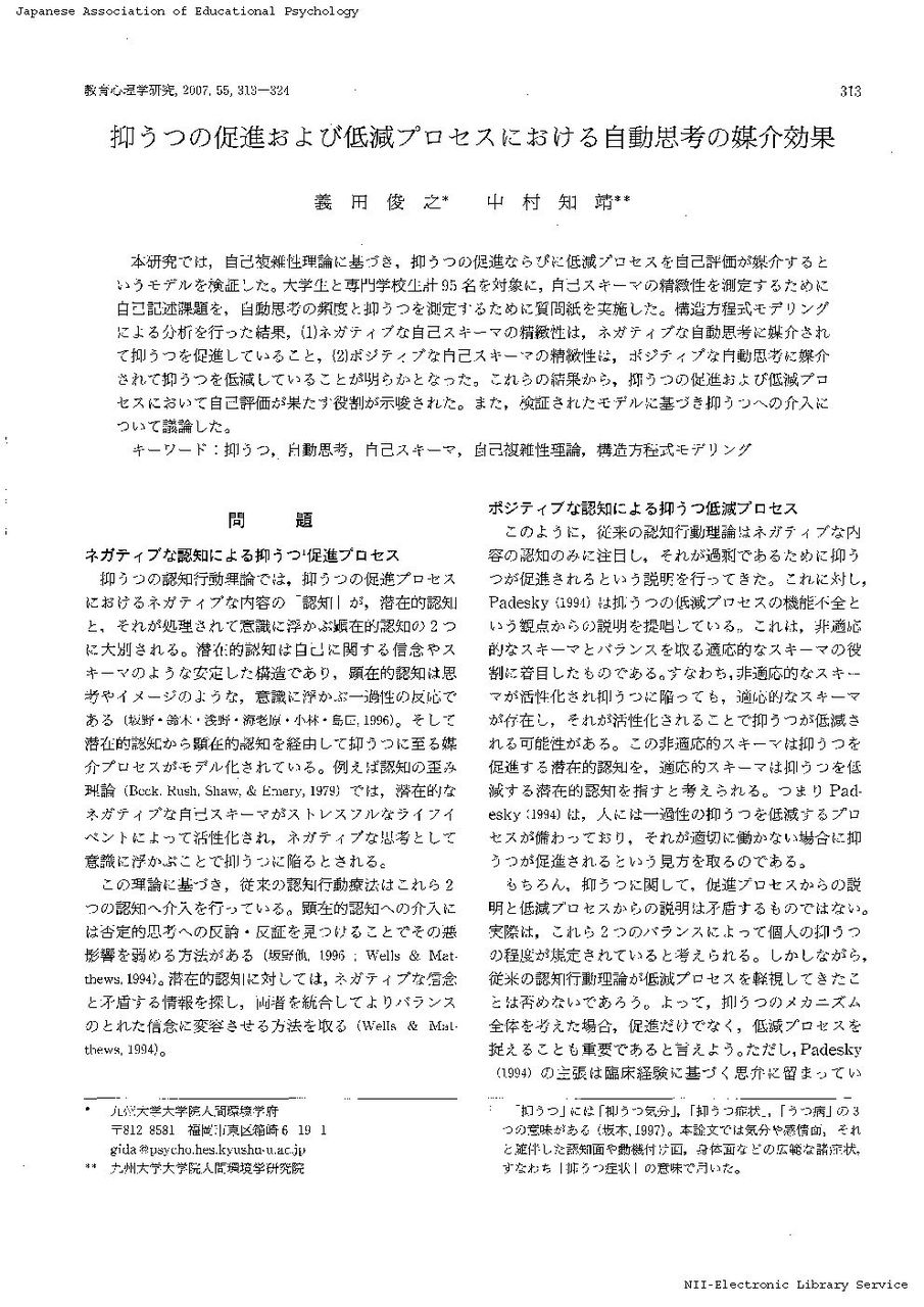 抑うつの促進および低減プロセスにおける自動思考の媒介効果