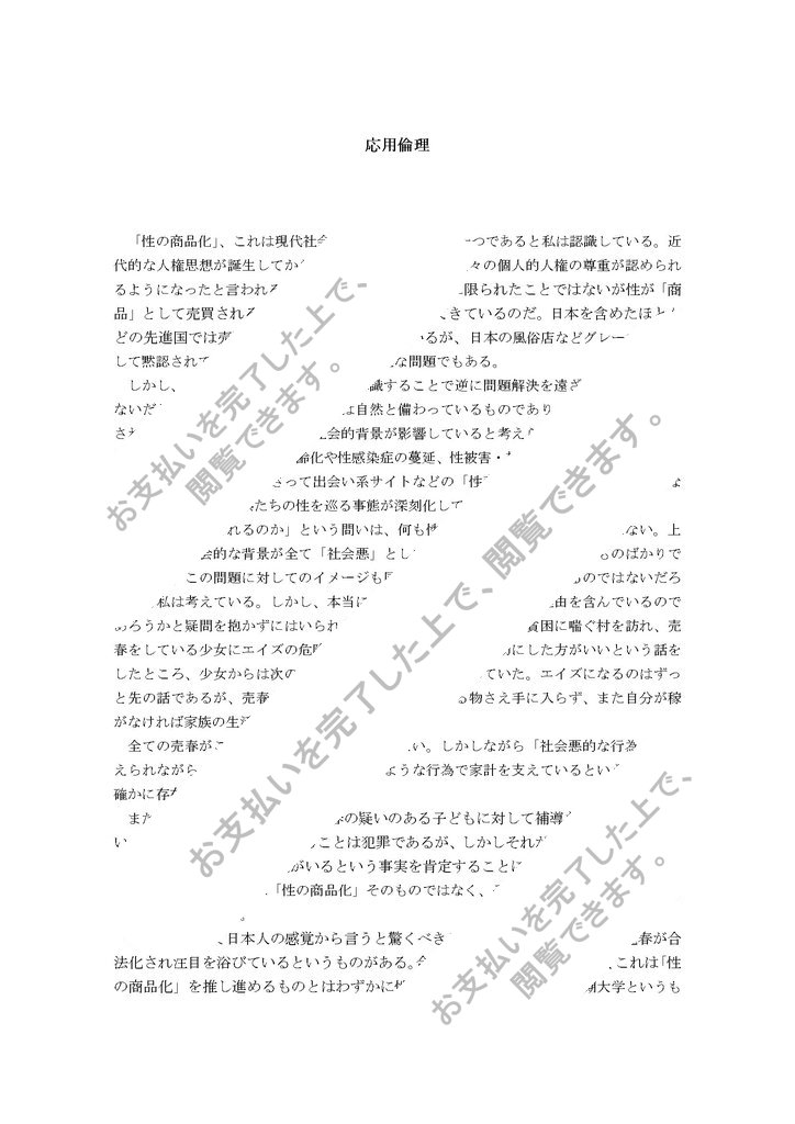 「性の商品化」、これは現代社会が抱える社会問題の一つであると私は認識している。近代的な人権思想が誕生してから今日では世界の全ての人々の個人的人権の尊重が認められるようになったと言われる。しかしながら現在、日本に限られたことではないが性が「商品」として売買されることが増加し、問題になってきているのだ。日本を含めたほとんどの先進国では売買春は違法であるとされているが、日本の風俗店などグレーゾーンとして黙認されているものもあり、解決の困難な問題でもある。
