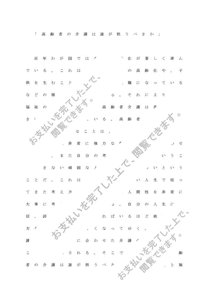 高齢者は非常に強力な個性を持ち合わせており、また自分の考えを変えるということできない頑固な人間が非常に多いということだ。これは自分たちが長い人生で培ってきた考え方、蓄積された人間性を非常に大事に考えるからである。自分の人生に自信、誇りを持っていればいるほど他の考え方を受け入れにくくなってゆく。そこで介護者はその人に合わせた介護の方法を行うことが要求される。そこでこれからの高齢者の介護は誰が担うべきか、在宅介護と施設介護を比較しながら論じていきたい。