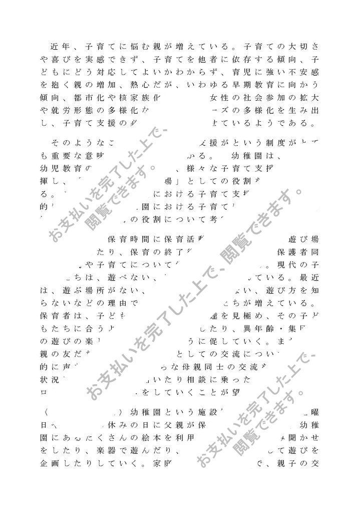 そのようなことから、子育て支援がという制度がとても重要な意味を持つことが分かる。 幼稚園は、地域の幼児教育のセンターとして、様々な子育て支援機能を発揮し、「親と子の育ちの場」としての役割を果たしている。ここでは、幼稚園における子育て支援について具体的に取り上げ、幼稚園における子育てに対する支援の方法や内容、保育者の役割について考察していく。