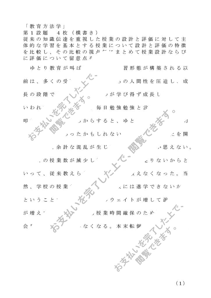 第1設題 4枚(横書き) 従来の知識伝達を重視した授業の設計と評価に対して主体的な学習を基本とする授業について設計と評価の特徴を比較し、その比較の視点毎にまとめて授業設計ならびに評価について留意点を述べよ。