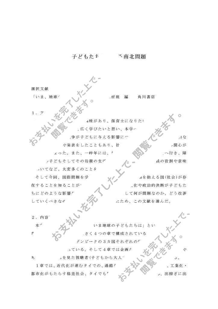 そして今回、国際問題を受講し、世界中で様々な問題を抱える国(社会)が存在することを知ることができた。そこで、社会の変化や政治的決断が子どもたちにどのような影響をもたらすのかを知り、そして何が問題なのか、どう改善していくべきなのか考えていきたいと思ったため、この文献を選んだ。