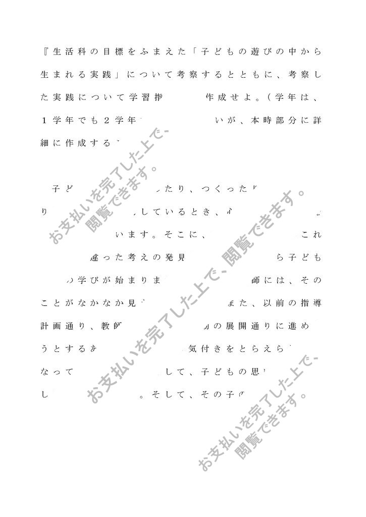 生活科概論 『生活科の目標をふまえた「子どもの遊びの中から生まれる実践」について考察するとともに、考察した実践について学習指導案を作成せよ。(学年は、1学年でも2学年でもかまわないが、本時部分に詳細に作成すること。』 |
