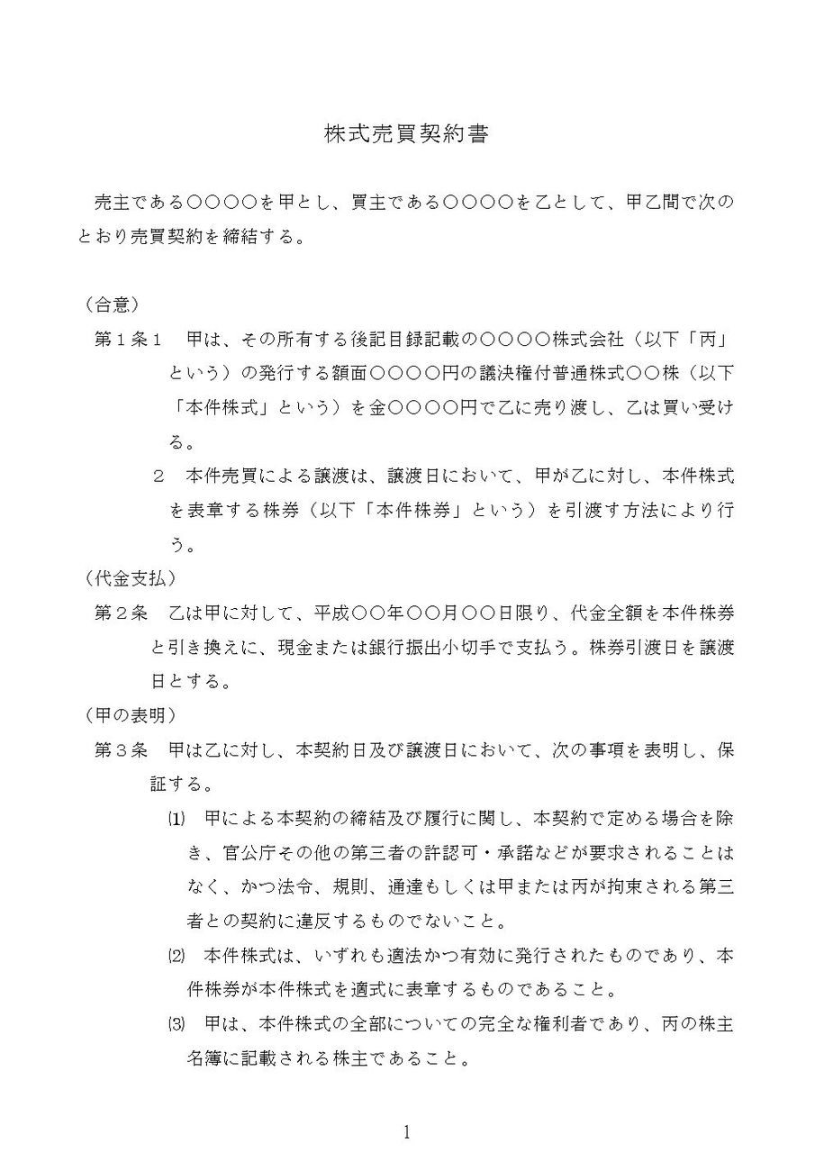 第1条1 甲は、その所有する後記目録記載の○○○○株式会社(以下「丙」という)の発行する額面○○○○円の議決権付普通株式○○株(以下「本件株式」という)を金○○○○円で乙に売り渡し、乙は買い受ける。
