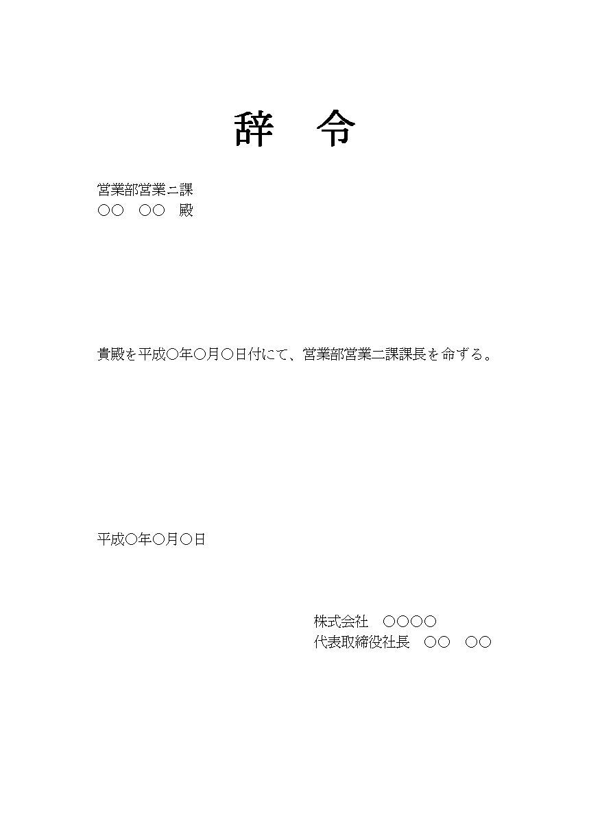 辞 令営業部営業ニ課○○ ○○ 殿貴殿を平成○年○月○日付にて、営業部営業二課課長を命ずる。平成○年○月○日株式会社 ○○○○ 代表取締役社長 ○○ ○○