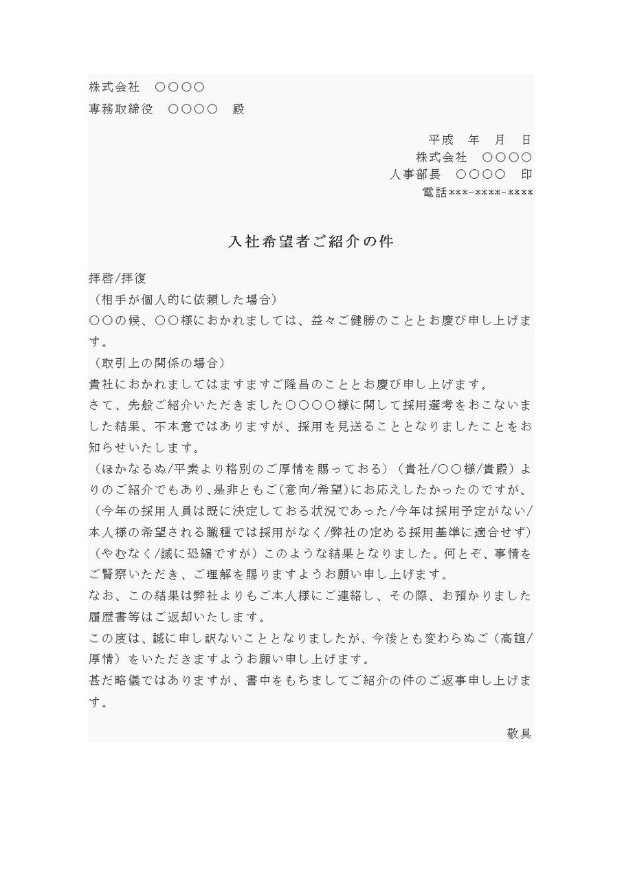拝啓/拝復 (相手が個人的に依頼した場合) ○○の候、○○様におかれましては、益々ご健勝のこととお慶び申し上げます。 (取引上の関係の場合) 貴社におかれましてはますますご隆昌のこととお慶び申し上げます。 さて、先般ご紹介いただきました○○○○様に関して採用選考をおこないました結果、不本意ではありますが、採用を見送ることとなりましたことをお知らせいたします。 (ほかなるぬ/平素より格別のご厚情を賜っておる)(貴社/○○様/貴殿)よりのご紹介でもあり、是非ともご(意向/希望)にお応えしたかったのですが、(今年の採用人員は既に決定しておる状況であった/今年は採用予定がない/本人様の希望される職種では採用がなく/弊社の定める採用基準に適合せず)(やむなく/誠に恐縮ですが)このような結果となりました。何とぞ、事情をご賢察いただき、ご理解を賜りますようお願い申し上げます。 なお、この結果は弊社よりもご本人様にご連絡し、その際、お預かりました履歴書等はご返却いたします。 この度は、誠に申し訳ないこととなりましたが、今後とも変わらぬご(高誼/厚情)をいただきますようお願い申し上げます。 甚だ略儀ではありますが、書中をもちましてご紹介の件のご返事申し上げます。