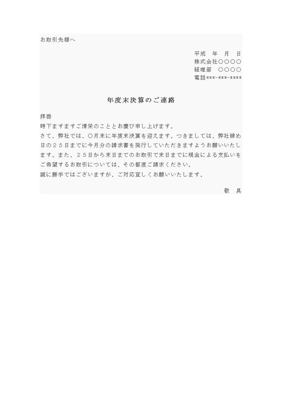 お取引先様へ 平成 年 月 日 株式会社○○○○ 経理部 ○○○○ 電話***-***-**** 年度末決算のご連絡拝啓 時下ますますご清栄のこととお慶び申し上げます。 さて、弊社では、○月末に年度末決算を迎えます。つきましては、弊社締め日の25日までに今月分の請求書を発行していただきますようお願いいたします。また、25日から末日までのお取引で末日までに現金による支払いをご希望するお取引については、その都度ご請求ください。 誠に勝手ではございますが、ご対応宜しくお願いいたします。敬 具