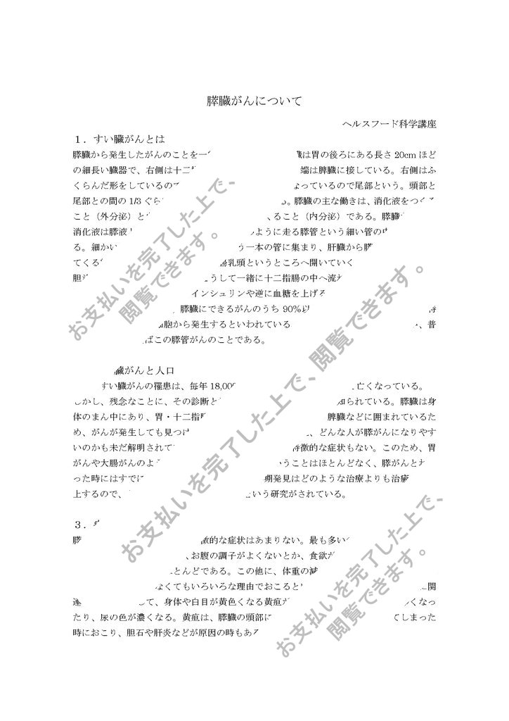 膵臓から発生したがんのことを一般に膵がんと呼ぶ。膵臓は胃の後ろにある長さ20cmほどの細長い臓器で、右側は十二指腸に囲まれており、左の端は脾臓に接している。右側はふくらんだ形をしているので頭部と呼び、左端は細長くなっているので尾部という。頭部と尾部との間の1/3ぐらいの大きさの部分を体部である。膵臓の主な働きは、消化液をつくること(外分泌)と血糖を調節するホルモンをつくること(内分泌)である。膵臓がつくる消化液は膵液と呼ばれ、膵臓の中を網の目のように走る膵管という細い管の中に分泌される。細かい膵管は膵臓の中で主膵管という一本の管に集まり、肝臓から膵頭部の中へ入ってくる総胆管と合流した後、十二指腸乳頭というところへ開いていく。肝臓でつくられた胆汁と膵臓でつくられた膵液はこうして一緒に十二指腸の中へ流れ込む。膵臓でつくられるホルモンは、血糖を下げるインシュリンや逆に血糖を上げるグルカゴンなどで、これらは血液の中に分泌される。膵臓にできるがんのうち90%以上は外分泌に関係した細胞、特に膵液を運ぶ膵管の細胞から発生するといわれている。...