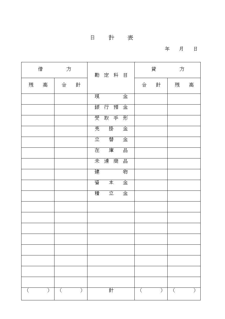 日 計 表 年 月 日 借 方 貸 方 勘 定 科 目 残 高 合 計 合 計 残 高 現 金 銀 行 預 金 受 取 手 形 売 掛 金 立 替 金 在 庫 品 未 達 商 品 建 物 資 本 金 積 立 金( ) ( ) 計 ( ) ( )