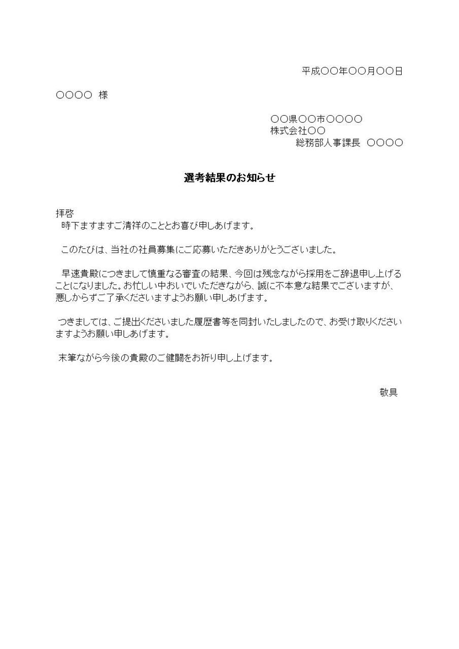 拝啓 時下ますますご清祥のこととお喜び申しあげます。 このたびは、当社の社員募集にご応募いただきありがとうございました。 早速貴殿につきまして慎重なる審査の結果、今回は残念ながら採用をご辞退申し上げることになりました。お忙しい中おいでいただきながら、誠に不本意な結果でございますが、悪しからずご了承くださいますようお願い申しあげます。 つきましては、ご提出くださいました履歴書等を同封いたしましたので、お受け取りくださいますようお願い申しあげます。 末筆ながら今後の貴殿のご健闘をお祈り申し上げます。