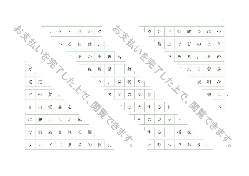 ガット・ウルグアイ・ラウンドの成果について述べるには、ガットが貿易上でどのような存在であるかを理解する必要がある。そのガットとは関税貿易一般協定と呼ばれる貿易協定のことであり、関税や各種輸出入規制などの貿易障壁を多国間の交渉によって除去し、自由貿易を維持および拡大する目的で19 48年に発足した協定である。そのガットの枠組みで実施される関税などに関する一括交渉をラウンド(多角的貿易交渉)と呼んでおり、ガット史上最長であり、最大の交渉がウルグアイ・ラウンドである。このウルグアイ・ラウンドの目的は、変化が著しい金融取引のサービス貿易、特許権などの知的所有権、貿易関連投資措置などの新分野についてルール策定や、農業貿易についてのルール強化、また、一方的措置の制限、ダンピング(不当廉売)規制の強化などの紛争処理手続きと制度的な枠組みの強化であった。