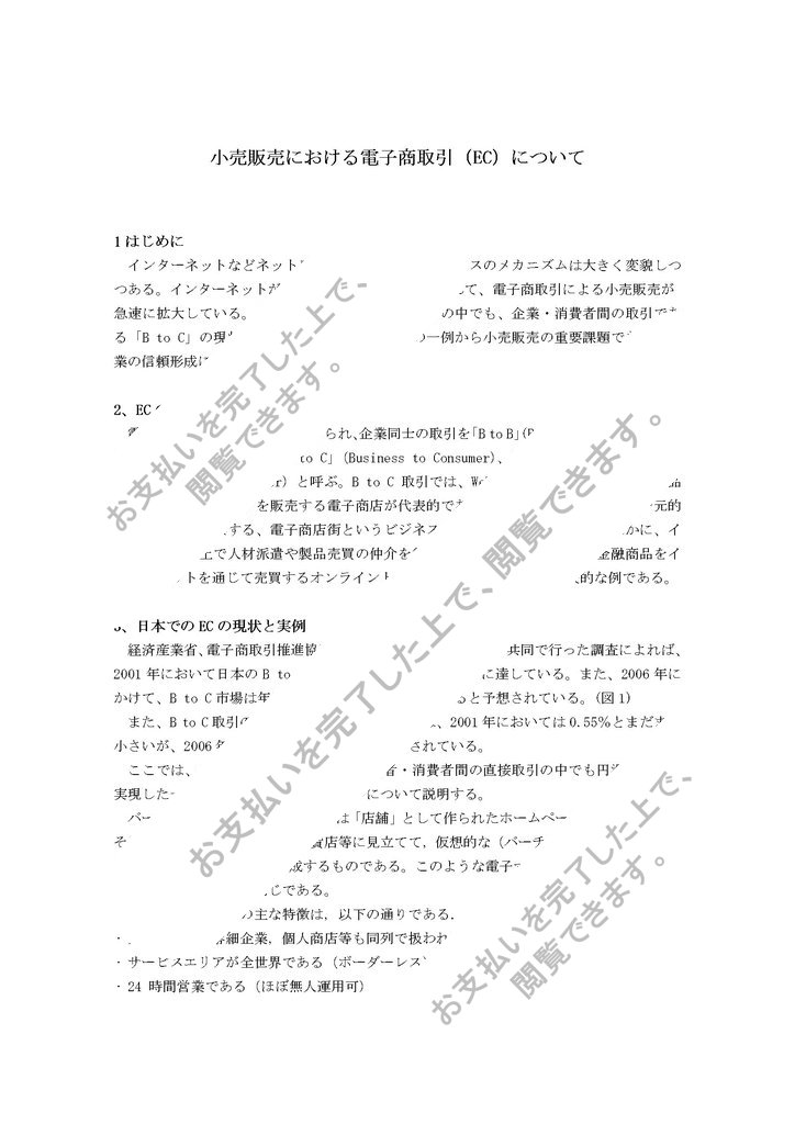 急速に拡大している。本レポートでは、電子商取引の中でも、企業・消費者間の取引である「B to C」の現状、そしてバーチャルモールの一例から小売販売の重要課題である仲介業の信頼形成について論じていく。