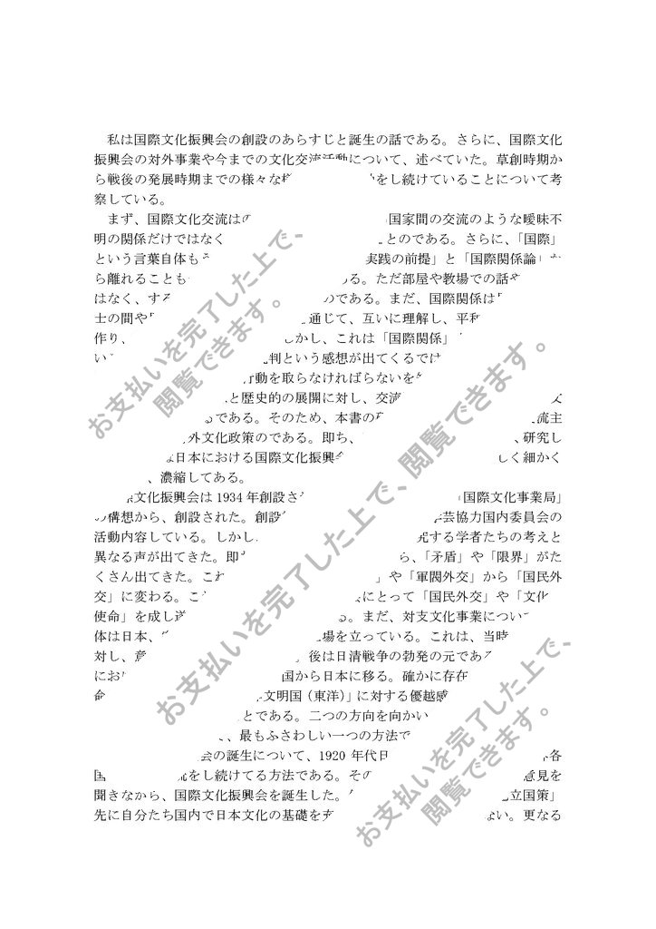 まず、国際文化交流はの定義について、単なる国家間の交流のような曖昧不明の関係だけではなく、国家や国民でもできることのである。さらに、「国際」という言葉自体もう一度認識すべきである。「実践の前提」と「国際関係論」から離れることも一つ重要なポイントのである。ただ部屋や教場での話や授業ではなく、すること自体一番大事なことのである。まだ、国際関係は異なる国同士の間や異なる国民の間での交流を通じて、互いに理解し、平和の国際社会を作り、維持することのである。しかし、これは「国際関係」という自体は難しいことでもある。逆に文化批判という感想が出てくるではないだろう。日本はこれについて、積極的な行動を取らなければらないを知り、試みをしている。最後、近代の国際関係と歴史的の展開に対し、交流活動の試みなど、日本の文化交流をやり遂げるである。そのため、本書の研究対象は国家間の文化交流主に...