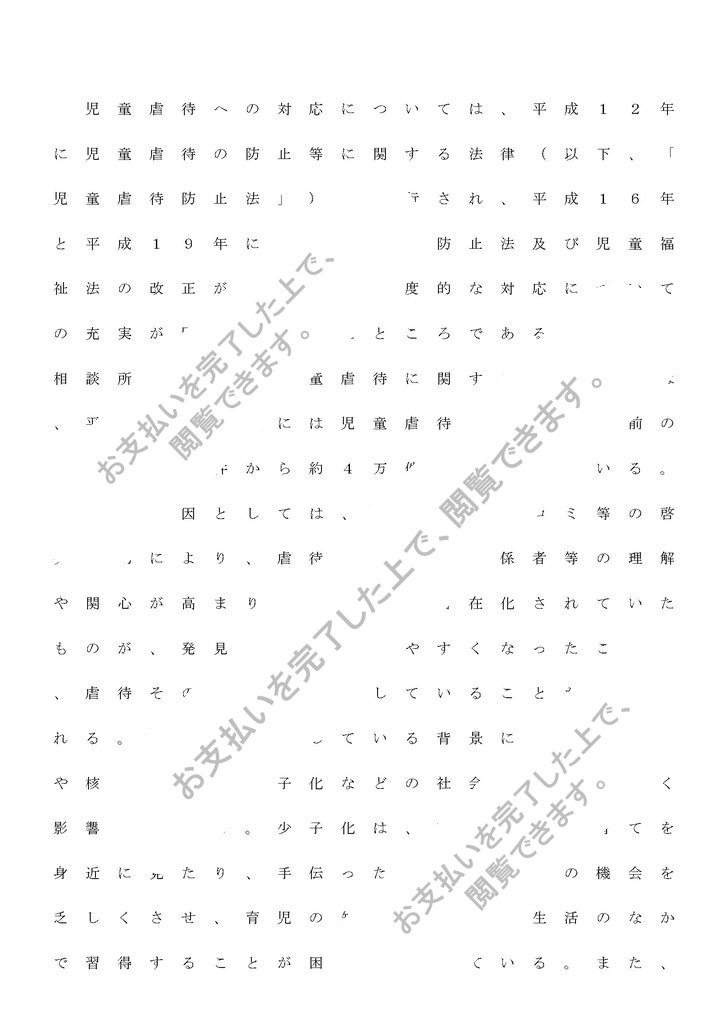 その要因としては、行政やマスコミ等の啓発活動により、虐待に対する関係者等の理解や関心が高まり、これまで潜在化されていたものが、発見・通告されやすくなったことや、虐待そのものが増加していることが考えられる。虐待が増加している背景には、都市化や核家族化、少子化などの社会問題が大きく影響している。少子化は、若い親が子育てを身近に見たり、手伝ったりするなどの機会を乏しくさせ、育児の知識や技術を生活のなかで習得することが困難となっている。また、都市化や核家族化の進行により、若い親が身近な場所で相談することができず、その結果、孤立感や閉塞感、不安や混乱などがストレスとなり、さらに様々な要因が重なり虐待へとエスカレートしていくと考えられる。 ...