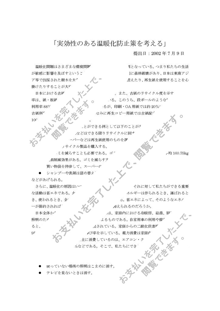 温暖化問題はさまざまな環境問題が結びつき、深刻な問題となっている。つまり私たちの生活が敏感に影響を及ぼすということである。温暖化の主な原因に森林破壊があり、日本は東南アジア等で伐採された樹木を大量に輸入している。紙の使用を控えたり、再生紙を使用することを心掛けたりすることが大切である。