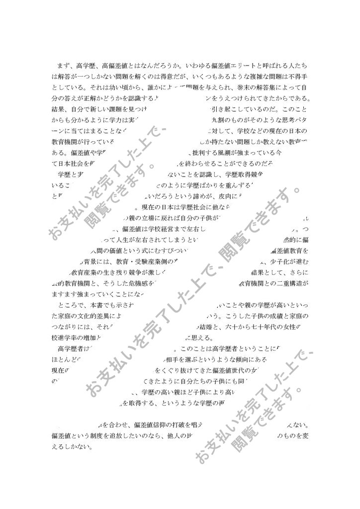 まず、高学歴、高偏差値とはなんだろうか。いわゆる偏差値エリートと呼ばれる人たちは解答が一つしかない問題を解くのは得意だが、いくつもあるような複雑な問題は不得手としている。それは幼い頃から、誰かによって問題を与えられ、巻末の解答集によって自分の答えが正解かどうかを認識するような思考パターンをうえつけられてきたからである。結果、自分で新しい課題を見つけられないという現象を引き起こしているのだ。このことからも分かるように学力は実力ではないのだ。世の中の九割のものがそのような思考パターンに当てはまることなく様々な答えを持っているのに対して、学校などの現在の日本の教育機関が行っていることは、九割がひとつの答えしか持たない問題しか教えない教育である。偏差値や学歴に支配された社会を悪として批判する風潮が強まっている今、はたして日本社会を偏差値信仰から解き放ち、神話を終わらせることができるのだろうか。