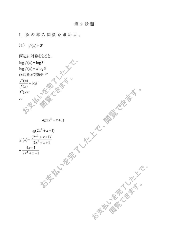 第2設題次の導入関数を求めよ。(1) (2) (3) 次の(1)と(2)を求めよ。(1) (2) (1) (2)