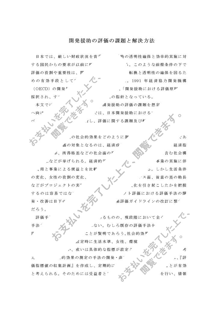 第一、被援助国側の社会的効果をどのように測るかは非常に難しい問題である。一般的に評価の対象となるのは、経済成長率、貯蓄率などのマクロ経済指標、生活水準、所得格差などの社会面の指標あるいは女性の地位を含む社会構造の変化などが挙げられる。経済的効果の場合、プロジェクト事業の実施に伴う費用と事業による便益とを比較して算出することができる。しか...