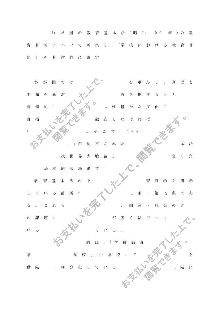 わが国の教育基本法(昭和22年)の教育目的について考察し、「学校における教育目的」を具体的に設定せよ。