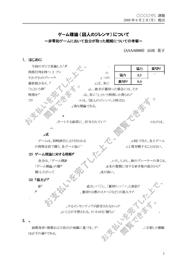 今回のゼミで実施した「非零和ゲーム」は、右表のような利得行列を持つ2プレーヤーによる対戦型ゲームである。それぞれのプレーヤーには、「協力」:「裏切り」という2つの選択肢があり、例えば、両者が互いに協調し合えば、共に「3」という利得を獲得する。また、一方が協調し、他方が裏切った場合には、それぞれ「0」:「5」という利得を獲得し、両者とも裏切った場合には、共に「1」という利得しか得られない。非零和ゲームの中でも、このような利得行列を示すモデルは、「囚人のジレンマ」と呼ばれ、実社会における利害対立・利害調整等を理解するうえで、有効な理論である。