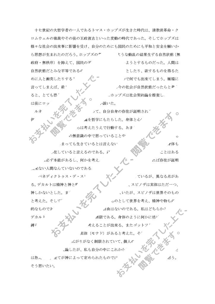 十七世紀の大哲学者の一人であるトマス・ホッブズが生きた時代は、清教徒革命・クロムウェルの独裁やその後の王政復古といった変動の時代であった。そしてホッブズは様々な社会の出来事に影響を受け、自分のためにも国民のためにも平和と安全を願いから思想が生まれたのだろう。ホッブズの考えはこのような動乱の結果生ずる自然状態(無政府・無秩序)を抑えて、国民の平和と安全の保持をしようとするものだった。人間は自然状態だとみな平等であるので、自分の平和を守ろうとしたり、欲するものを得るために人と衝突したりすると、抑える主権者や法もないので何でも出来てしまう。極端に言ってしまえば、殺し合いも可能なのである。もし今の社会が自然状態だったらと考えると、とても恐ろしい。これらを抑えるためにホッブズは社会契約論を提案し、これらは後にロックやルソーも内容は多少違うが説いた。