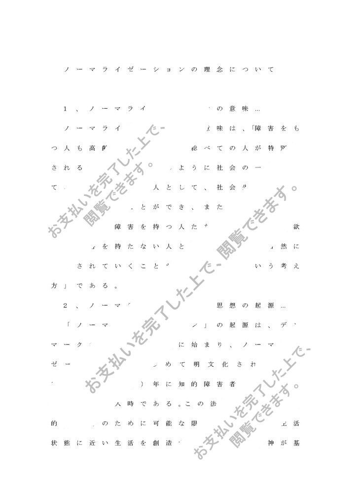 ノーマライゼーションの意味は、「障害をもつ人も高齢者も子どもも総べての人が特別視されることなく、同じように社会の一員として、当たり前の個人として、社会生活に参加し、行動することができ、また日常の生活においては、障害を持つ人たちのいろいろな欲求が障害を持たない人と同様に、ごく自然に満たされていくことが当然であるという考え方」である。 2、ノーマライゼーション思想の起源…