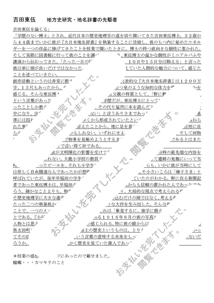 「学歴のない博士」とされ、近代日本の歴史地理学の道を切り開いてきた吉田東伍博士。32歳から44歳までいかに彼が『大日本地名辞書』を執筆することに没頭し、彼のもつ内に秘めたエネルギーを一つの作品に捧げてきたことを授業で聞いたときに、博士の持つ直向きな個性に惹かれた。そして実際に図書館に行って彼のことを調べるにあたり、東伍博士の温かな個性がミニアルバムや講演から伝わってきた。「たった一日の図書館での調査で、10日や15日分は賄える」と言った彼は単に頭が良いだけではなかった。今回は東伍博士の備えていた人間的な魅力について、感じたことを述べていきたい。