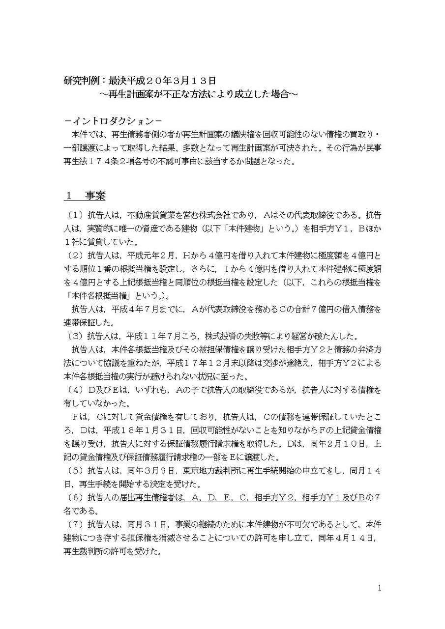 ☞ 以下、まず、再生計画等に関する知識をまとめる。次に、4で「不正な方法」に関する学説(裁判例はないので・・・。)を...