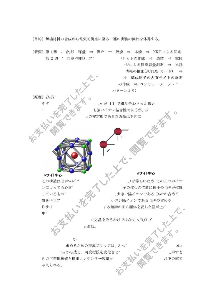 〔目的〕無機材料の合成から電気的測定に至る一連の実験の流れを体得する。