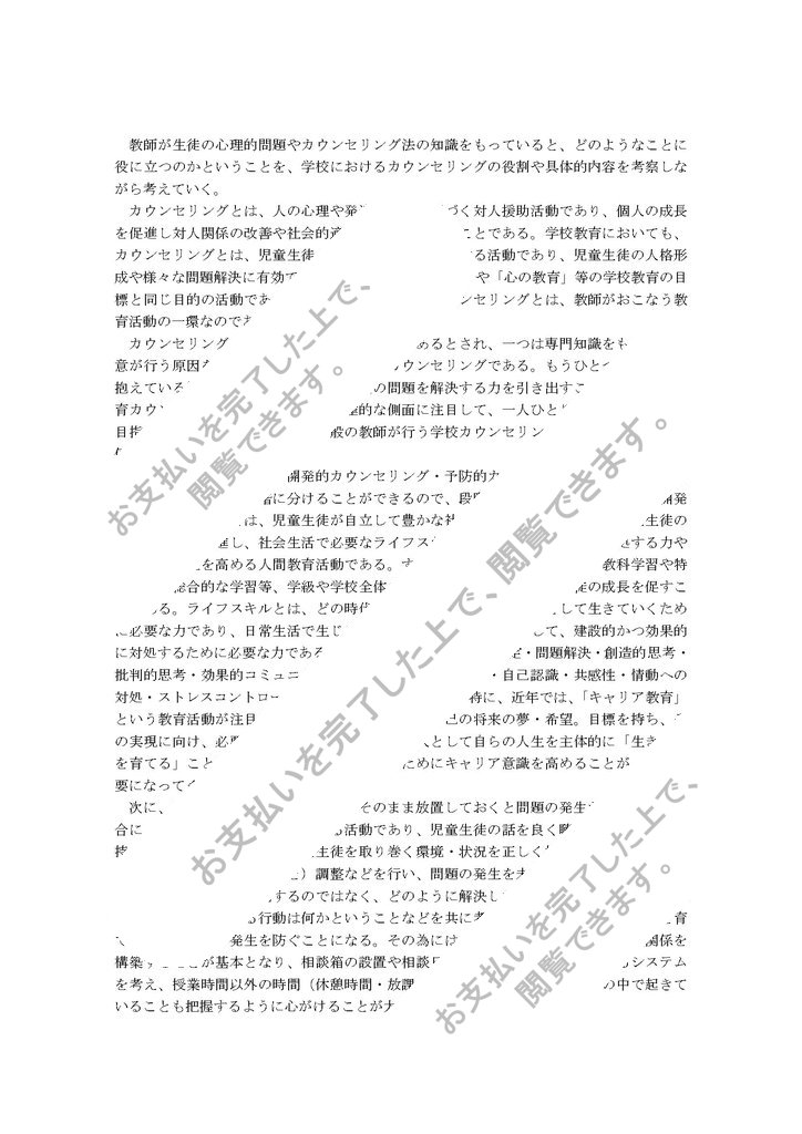 カウンセリングの種類は、大きく分けて2つあるとされ、一つは専門知識をもったプロ意が行う原因を追求し病気を治療する治療カウンセリングである。もうひとつは、問題を抱えている児童生徒と関わり、児童生徒の問題を解決する力を引き出すことを援助する教育カウンセリングである。生徒の発達的な側面に注目して、一人ひとりの全人的な発達を目指す教育カウンセリングは、一般の教師が行う学校カウンセリングではより実践的...