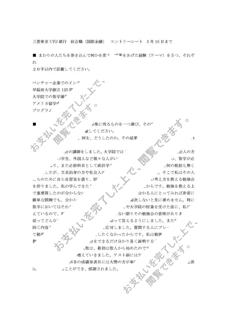 三菱東京UFJ銀行 総合職(国際金融) エントリーシート 3月16日まで