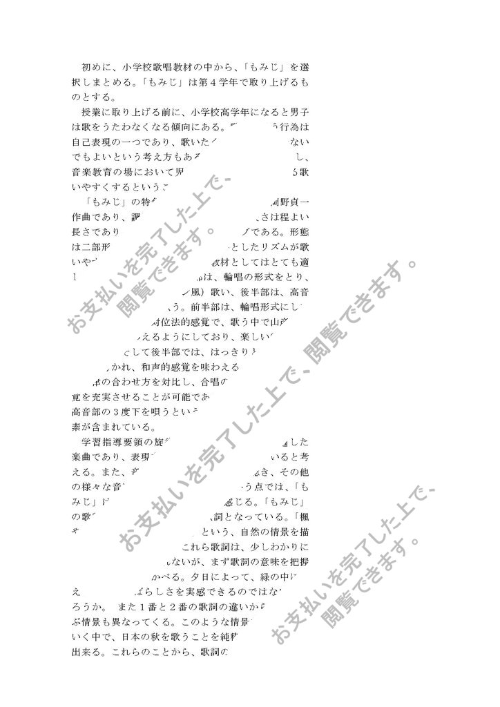 「もみじ」の特色として、高野辰之作詞、岡野貞一作曲であり、調性はト長調である。曲の長さは程よい長さであり、音域レ~ミの1オクターブである。形態は二部形式であり、明快で伸び伸びとしたリズムが歌いやすくしている。そのため、教材としてはとても適している。二部形式の前半部は、輪唱の形式をとり、追いかけるように(カノン風)歌い、後半部は、高音部と低音部に別れて歌う。前半部は、輪唱形式にしてあることにより、対位法的感覚で、歌う中で山彦のような感覚を味わえるようにしており、楽しい雰囲気を味わえる。そして後半部では、はっきりとした高音と低音に分かれ、和声的感覚を味わえる。前半と後半とで旋律の合わせ方を対比し、合唱の響き等...