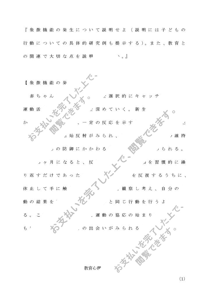 『象徴機能の発生について説明せよ(説明には子どもの行動についての具体的研究例も提示する)。また、教育との関連で大切な点を説明しなさい。』