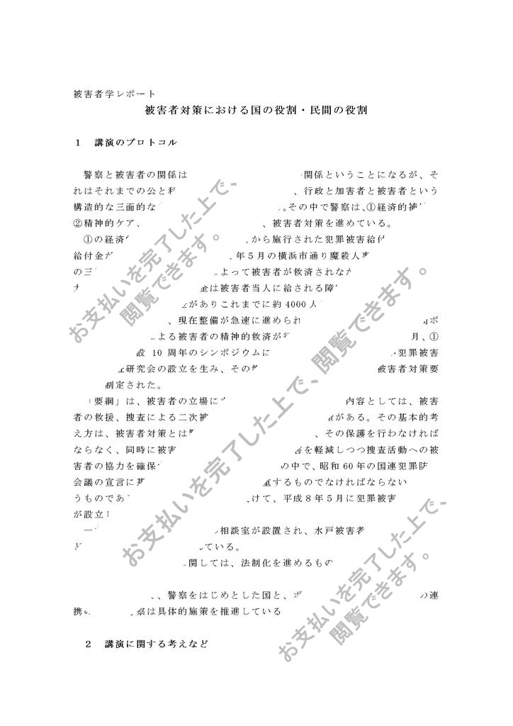 具体的施策の中では、いかに被害者とコミュニケーションを取るか、という点に重点があったと思うが、物理的被害に関しては刑罰や補償等でカバーできるとしても、精神的被害に関しては被害者が精神を癒されないことにはどうしようもない。そのためにはカウンセリング等による被害者の復帰が欠かせないが、これに関しては民間が受け持つべきだろう。というのは、警察のイメージとして、一般人は近づきにくいというものがあり、警察がからんでくると気軽に相談も出来ない雰囲気があると思われるからである。民間ボランティアによるカウンセリングで被害者の心にゆとりができてから、警察がかかわってくるというかたちも考えられ得るのではないだろうか。