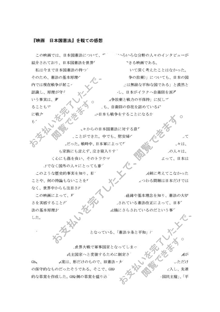 この映画を観て、国外の人々からの日本国憲法に対する意見や想い、また戦争を体験した人々の貴重な話を聞くことができた。中でも、慰安婦の人の体験談は、同じ女性としては身につまされる話だった。戦時中、日本軍によって強制的に慰安婦にさ...