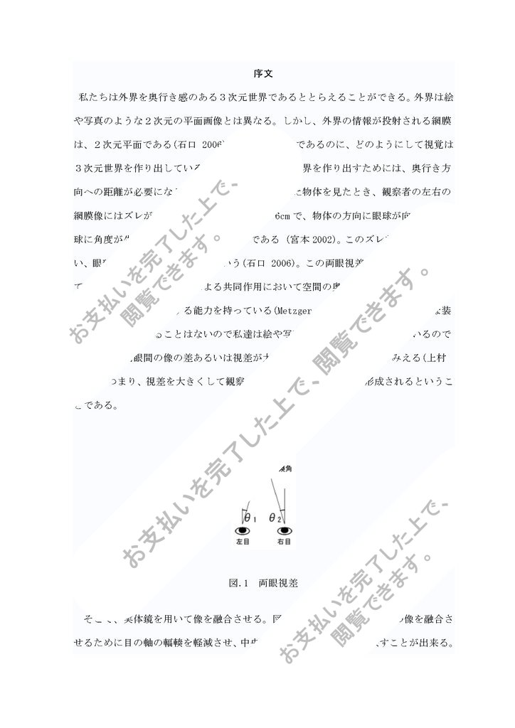 私たちは外界を奥行き感のある3次元世界であるととらえることができる。外界は絵や写真のような2次元の平面画像とは異なる。しかし、外界の情報が投射される網膜は、2次元平面である(石口 2006)。網膜は2次元であるのに、どのようにして視覚は3次元世界を作り出しているのだろうか。3次元世界を作り出すためには、奥行き方向への距離が必要になる。奥行き方向に配置された物体を見たとき、観察者の左右の網膜像にはズレが生じる。両眼間の間隔は約6cmで、物体の方向に眼球が向くため眼球に角度が生じるため、ズレが生じるのである (宮本2002)。このズレを両眼視差といい、眼球に生じた角度を輻輳角という(石口 2006)。この両眼視差が奥行きを作り出している。両眼は、この視差による共同作用において空間の奥行の近くを、高さや幅の知覚と同様に直接媒介する能力を持っている(Metzger,1968)。 両眼視差は特別な装置を使わずに起こることはないので私達は絵や写真を平面であると認識しているのである。また両眼間の像の差あるいは視差が大きいと、二重像ははっきりみえる(上村 1966)。つまり、視差を大きくして観察...