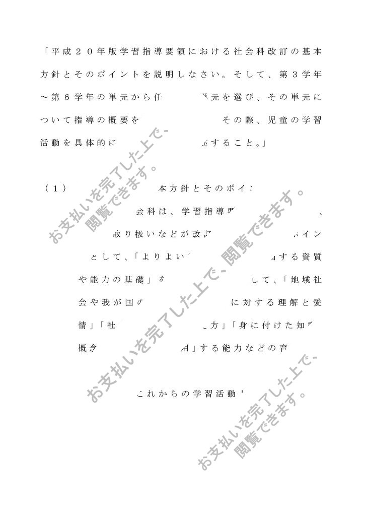 「平成20年版学習指導要領における社会科改訂の基本方針とそのポイントを説明しなさい。そして、第3学年~第6学年の単元から任意で1単元を選び、その単元について指導の概要を説明しなさい。その際、児童の学習活動を具体的にイメージして論述すること。」