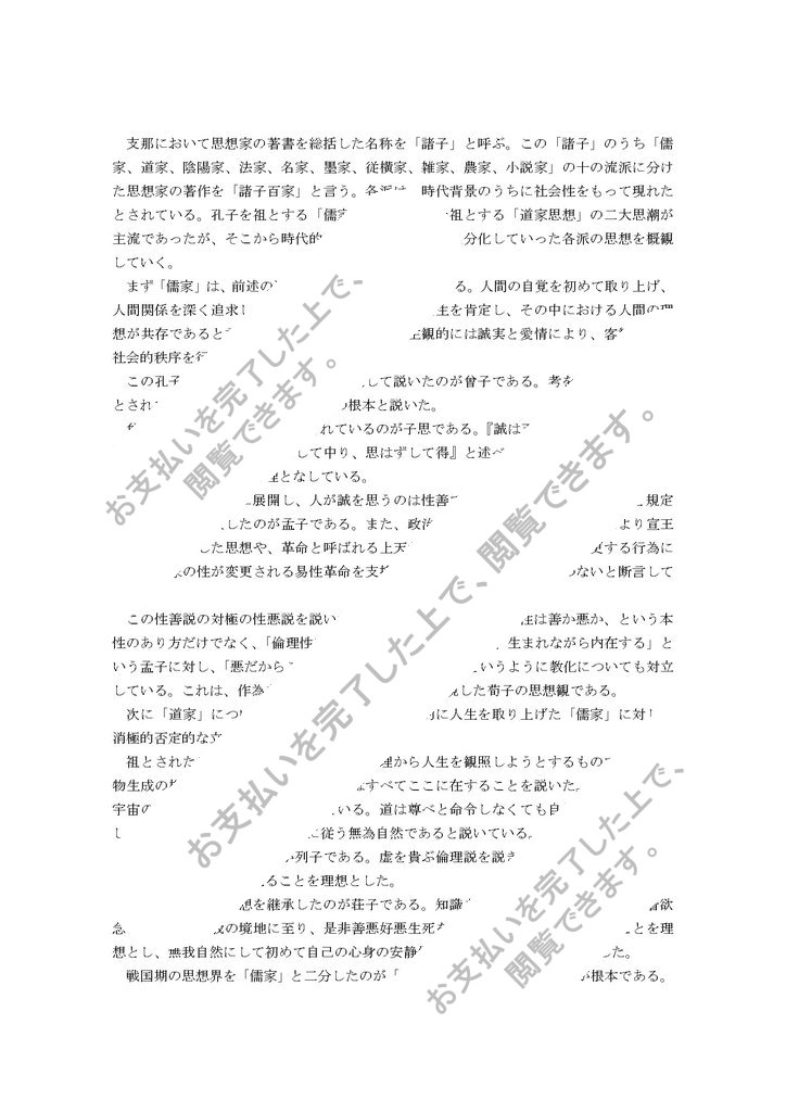 支那において思想家の著書を総括した名称を「諸子」と呼ぶ。この「諸子」のうち「儒家、道家、陰陽家、法家、名家、墨家、従横家、雑家、農家、小説家」の十の流派に分けた思想家の著作を「諸子百家」と言う。各派は、時代背景のうちに社会性をもって現れたとされている。孔子を祖とする「儒家思想」と老子を祖とする「道家思想」の二大思潮が主流であったが、そこから時代的要求に応じて異を唱え分化していった各派の思想を概観していく。