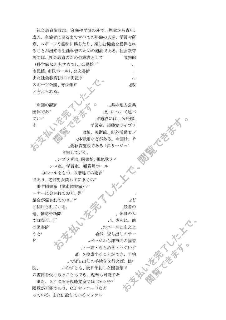 今回の課題においては、私の出身県三重県の地方公共団体である「津市」(団体コード242012)について述べていくこととする。津市の社会教育施設には、公民館、市民会館、文化会館、図書館、学習室、視聴覚ライブラリー、視聴覚センター、博物館、美術館、野外活動センター、市民プール、市民体育館などがある。今回は、その中から総合的な社会教育施設である「津リージョンプラザ」について考察していく。