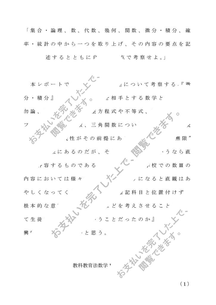 「集合・論理、数、代数、幾何、関数、微分・積分、確率・統計の中から一つを取り上げ、その内容の要点を記述するとともに自分の視点で考察せよ。」